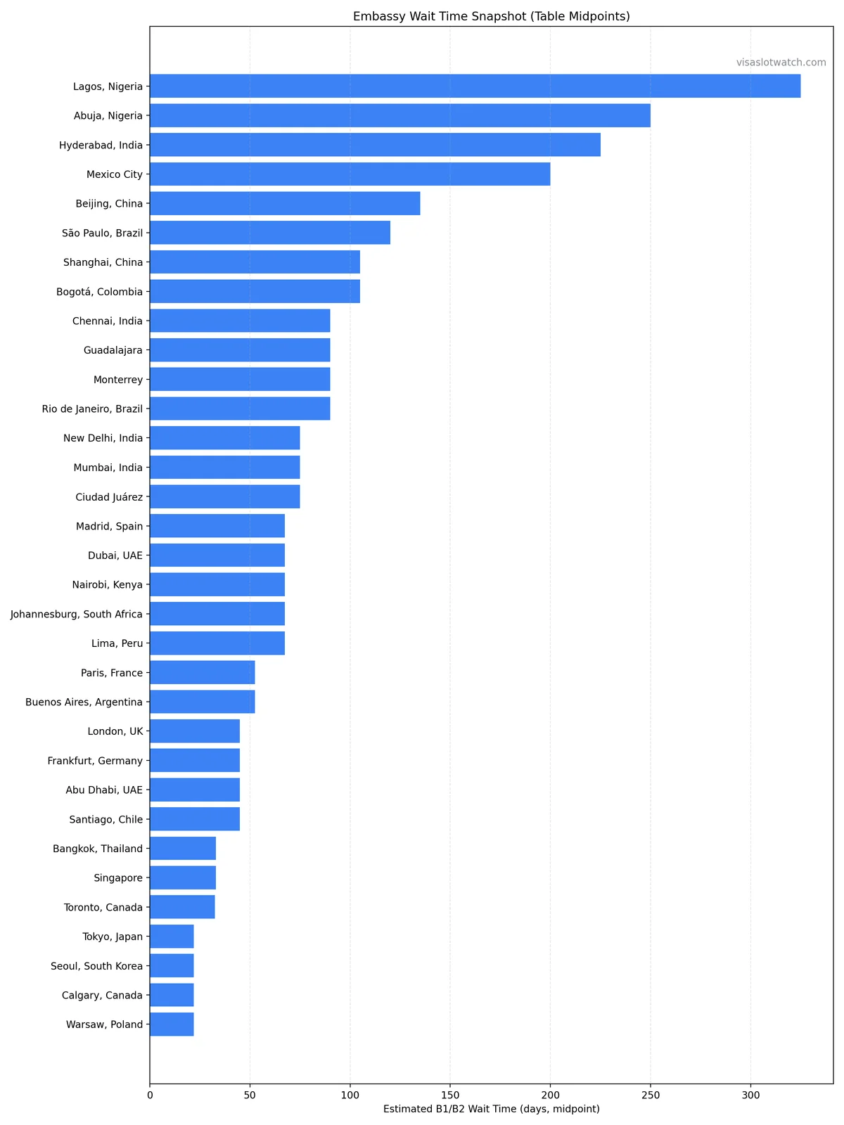 Local demand: Countries with high US travel volume (India, Nigeria, Mexico, Brazil) have far more applicants than available slots. India alone had wait times exceeding 800 days in mid-2022 before aggressive staffing brought many posts down into ~60–90 day ranges by late 2024, though some cities remained longer.